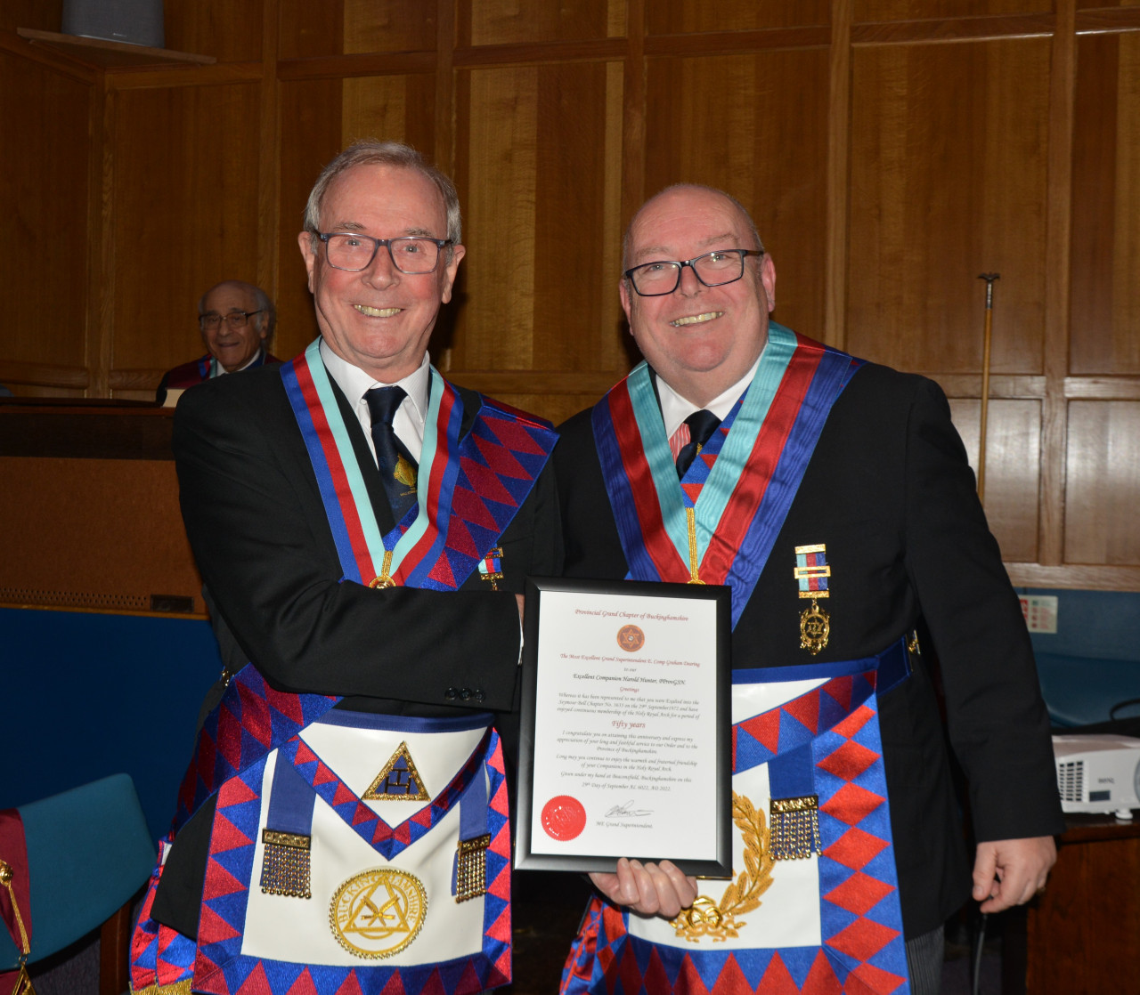 At the Buckinghamshire First Principals Chapter meeting on 13th March 2023, Harry was presented with his 50 years certificate by the ME Grand Superintendent, E. Comp Graham Dearing. Harry had absolutely no idea that this was going to happen and was left speechless. This presentation was witnessed by some 65 companions.